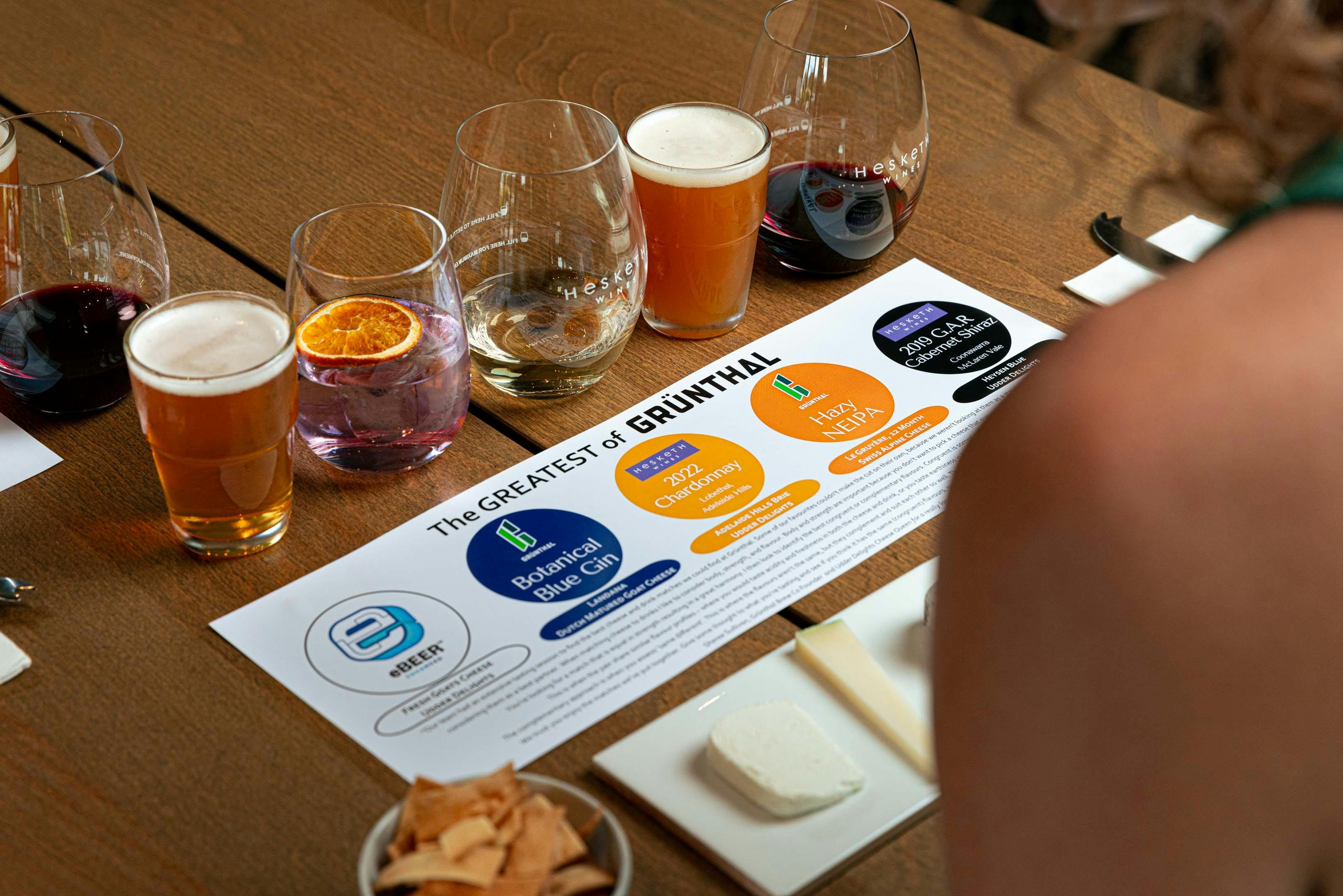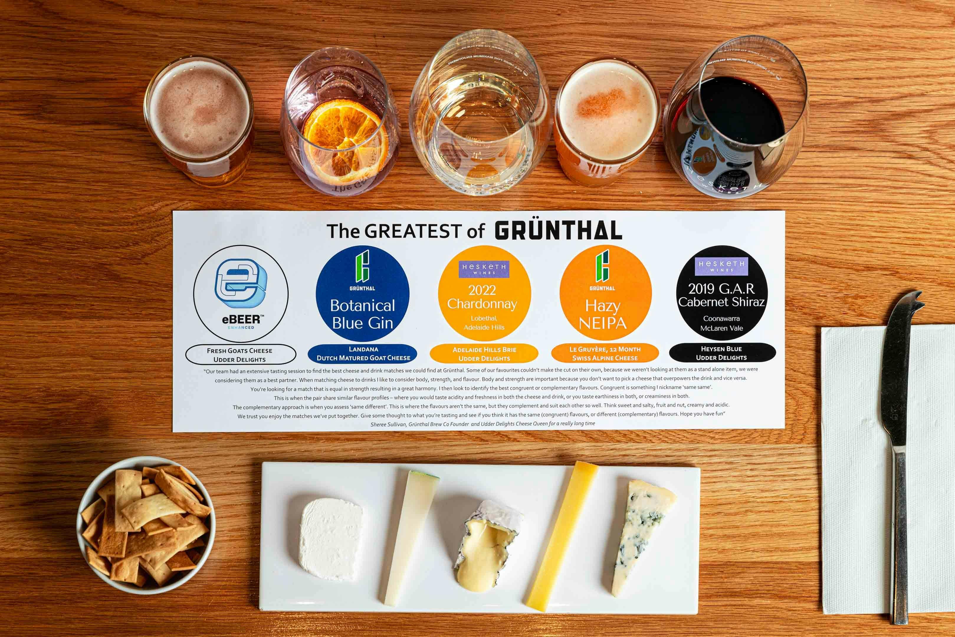 This is the ultimate way to experience everything Grünthal Brew has to offer—all in one delicious sitting. Guests will enjoy: One Grünthal Gin & Tonic Two Grünthal Beers Two Hesketh Wines Five artisan cheeses, including some from Udder Delights. All perfectly matched on a curated tasting journey.